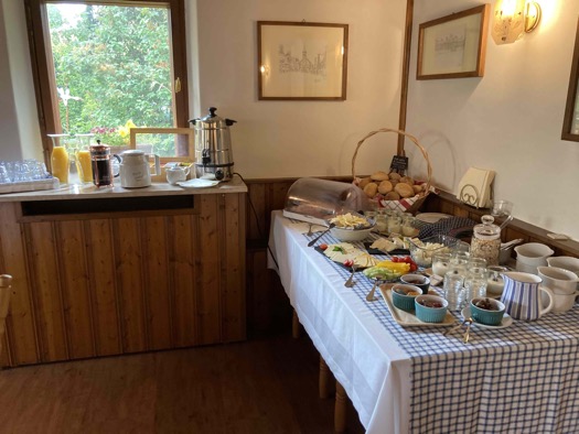 In unserem gemütlichen Frühstücksraum mit historischen Deckenbalken finden bis zu 30 Personen Platz, zum Beispiel im Rahmen eines Geburtstagskaffees, eines Seminars oder zu anderen Gelegenheiten.